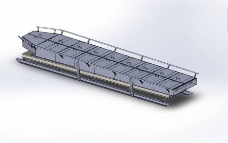 Для изменения скорости потока мы разработали специальные шлюзы с возможностью регулировки угла наклона в диапазоне 5 градусов. Это дает клиенту возможность выбирать оптимальный угол при обогащении без остановки производства и привлечения дополнительной техники. Шлюзы для заказчика мы установили на салазки — жесткая рама на санях позволяет транспортировать нашу разработку на большие расстояния без деформаций по пересеченной местности. Увеличенная площадь салазок также минимизирует давление на грунт, что не дает шлюзам просаживаться в период эксплуатации.