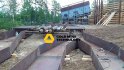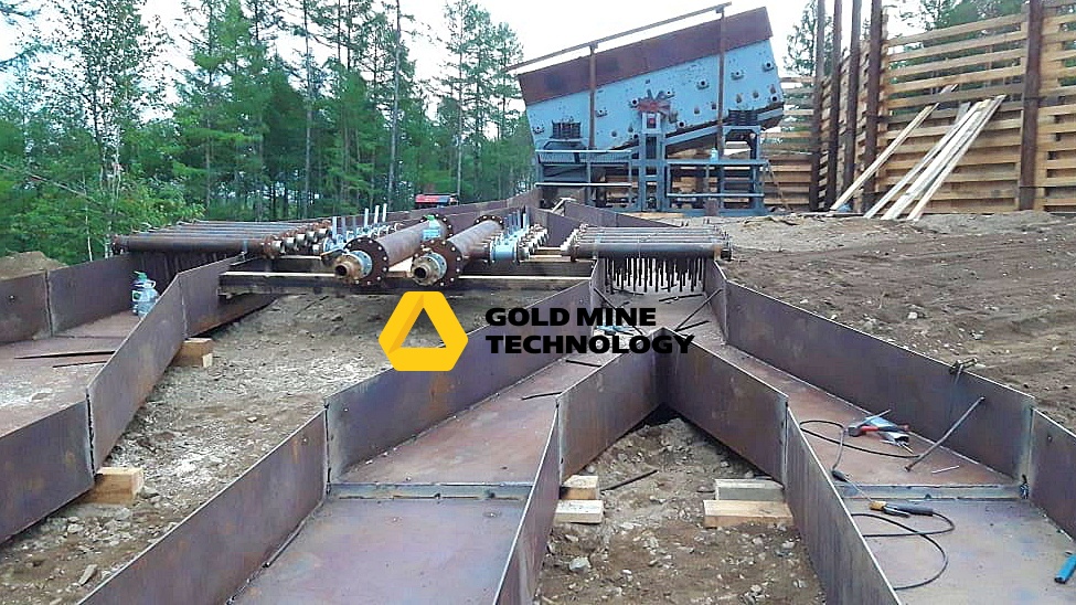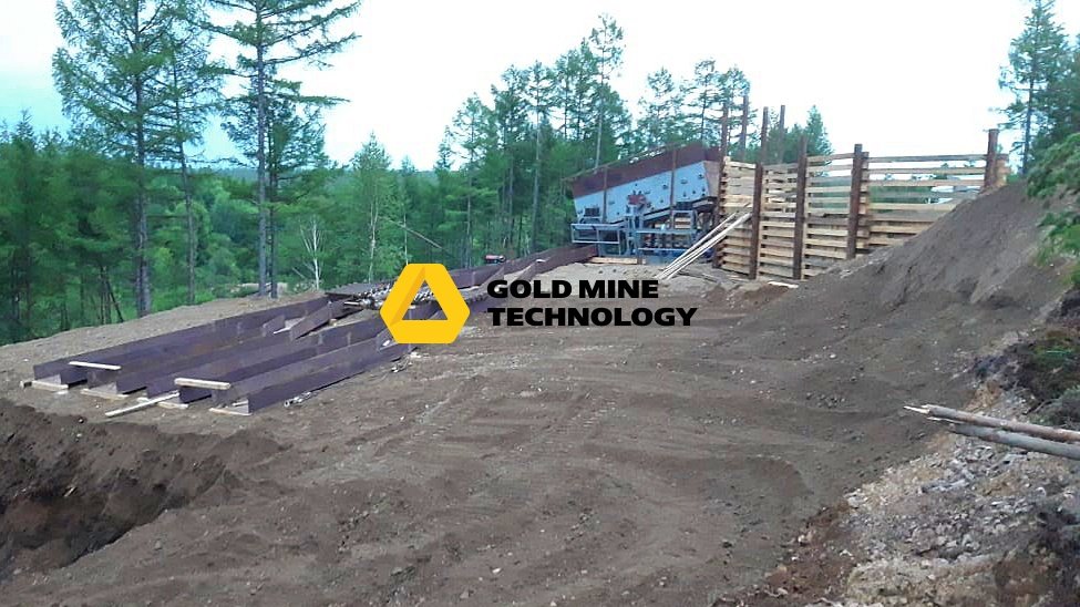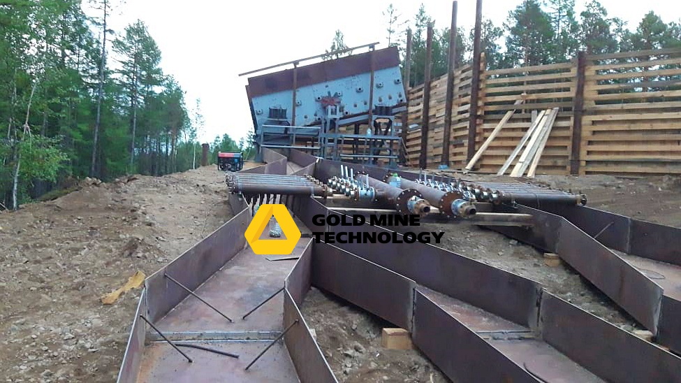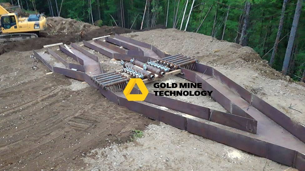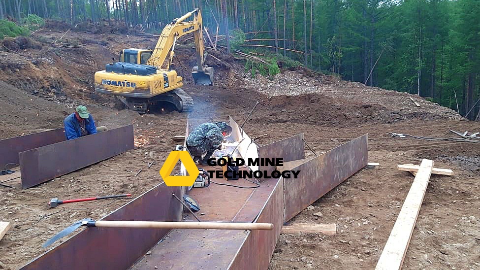 После установки грохота, последовал монтаж шлюзового агрегата. Для того, чтобы управление потоком пульпы происходило непосредственно на шлюзе, шлюзовой агрегат смонтирован с системой дополнительного орошения. А для стока хвостов в технологический отстойник, подготовлен специальный под уклоном котлован, сообщающийся с отстойником. Хвосты в нем будут размещаться самотеком.